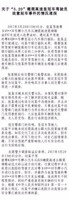 5月24日,东莞警方向媒体发布情况通报。通报称,沃尔沃车主在案发后向交警部门报警求助。东莞高速公路大队接报后对此展开调查,锁定皇冠车驾驶员为刘某平,并传唤双方当事人到交警大队作进一步调查。