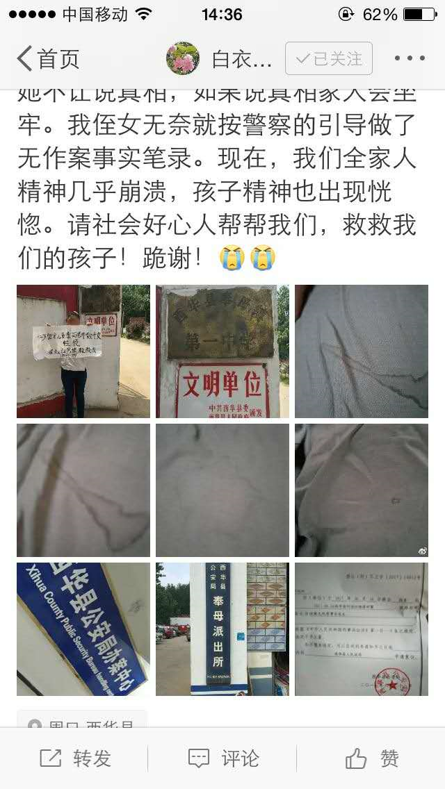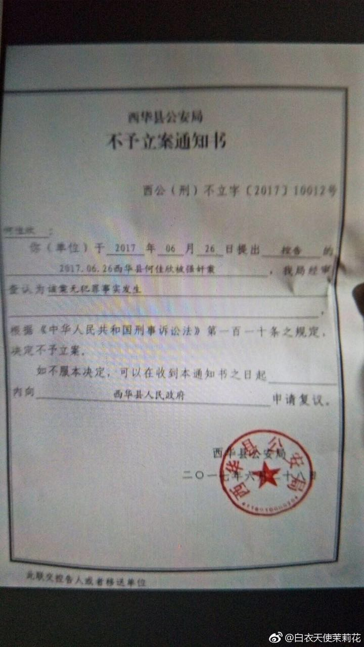 记者查阅了西华当地警方微博“平安西华”,该微博确实发布了一条名为“关于对网民‘白衣天使茉莉花’在新浪微博发布严重失实信息的情况通报”的消息,该消息称“2017年7月4日14时许,网民‘白衣天使茉莉花’在其个人新浪微博上炮制所谓‘西华县奉母镇一中发生强奸案’的信息,制造炒作噱头,吸引网民眼球,扰乱网络公共安全秩序。经公安机关调查其所发信息严重失实,随后,公安机关将澄清事实真相并将对信息发布者依法严惩。”随后,记者又联系了西华县警方,但对方接电话的人员表示,自己这里只是报警电话,无法回答记者问题,当记者要求对方提供相关电话时,对方表示,“我们这里都用小号,没用长号,你拿到也没用,打不过去,要么你就直接来局里。”