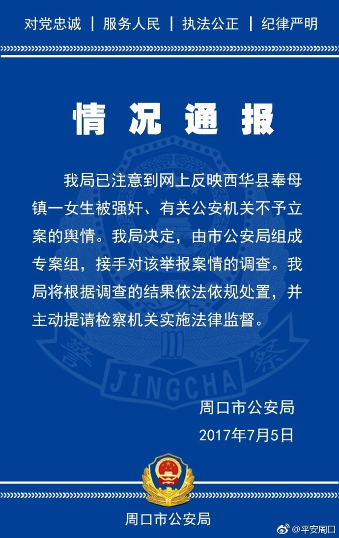 平安周口7月5日消息 我局已注意到网上反映西华县奉母镇一女生被强奸、有关公安机关不予立案的舆情。我局决定,由市公安局组成专案组,接手对该举报案情的调查。我局将根据调查的结果依法依规处置,并主动提请检察机关实施法律监督。